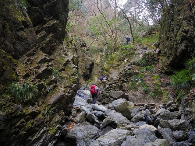① ルート詳細: 白谷沢のゴルジュ(岩の壁)歩きが最大の見どころ。関東とは思えないようなアドベンチャーな景色を楽しめます。